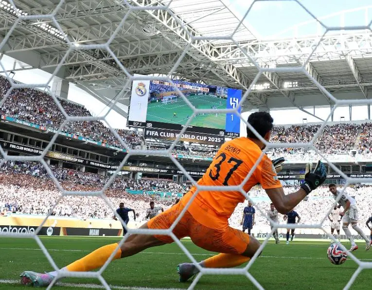 当比赛进入到伤停补时阶段,迈阿密硬石体育场全场的目光都聚焦在利雅得新月的禁区之内。皇马大将巴尔韦德在十二码前调整呼吸,利雅得新月门将布努在门线上轻轻跃动。主裁判一声哨响,巴尔韦德助跑射门,布努如猎豹一般判断对方向,迅速扑向右侧,单掌将球拒之门外。布努补时阶段扑点,再度上演封神时刻。这一扑,让皇马主帅阿隆索的首秀开门红化为泡影;这一扑,为亚洲球队赢得世俱杯改制后的首个积分;这一扑,让所有人再次见识到这位世界杯传奇门将的风采。